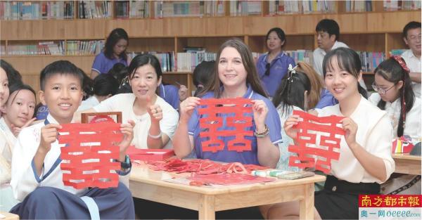 在西丽小学食堂,两校师生品尝了大厨们精心准备的中国家常菜、南山荔枝和深圳制造的“喜茶”。随后,两校师生来到西丽小学图书馆内体验非遗活动。