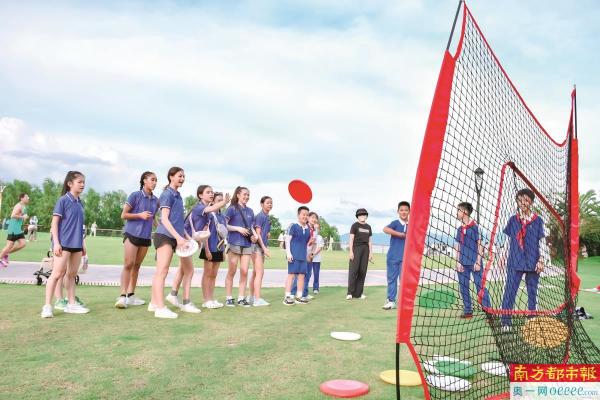 中美师生在深圳湾公园开启一场飞盘游戏。