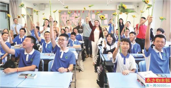 龙外(集团)云和学校,老师和应考学生手拿向日葵加油。
