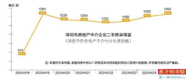 据深圳房地产中介协会最新数据统计,2024年第25周(6.17-6.23)全市二手房(含自助)录得1362套,环比增长4.0%,周二手房录得量(网签量)走势呈现三连涨,并在本周再次创近三年以来新高。
