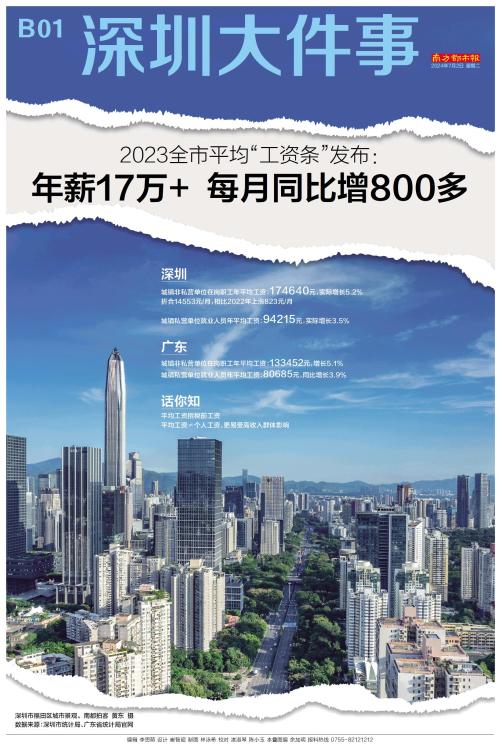 深圳 城镇非私营单位在岗职工年平均工资:174640元,实际增长5.2% 折合14553元/月,相比2022年上涨823元/月 城镇私营单位就业人员年平均工资:94215元,实际增长3.5%