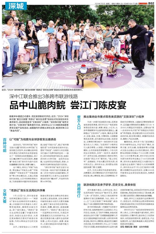 随着深中通道正式通车,湾区旅游新时代开启。近日,“2024‘深圳有可能’夏日文旅暨‘湾游记’音乐生活周”启动仪式在宝安区欢乐港湾举行。活动现场发布“文旅深圳”小程序、“深圳有可能”城市文旅计划、“