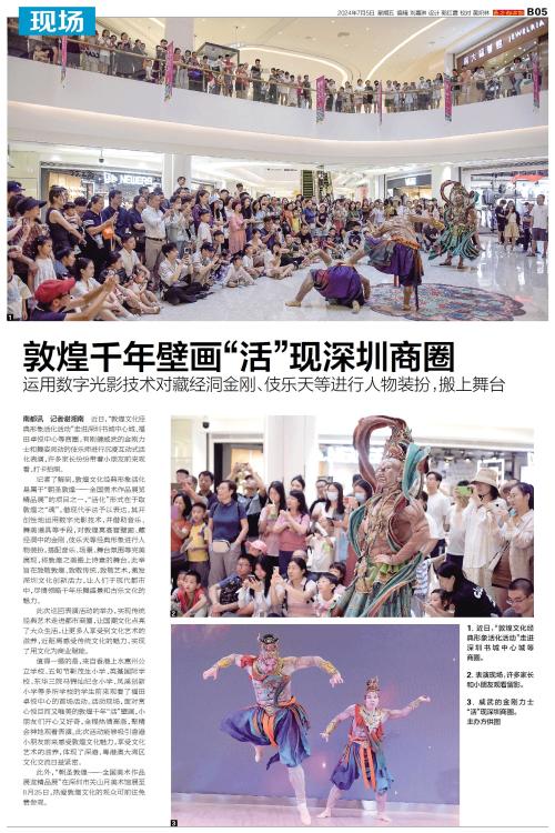 南都讯记者谢湘南 近日,“敦煌文化经典形象活化活动”走进深圳书城中心城、福田卓悦中心等商圈。有刚健威武的金刚力士和舞姿灵动的伎乐师进行沉浸互动式活化表演,许多家长纷纷带着小朋友前来观看、打卡拍照。