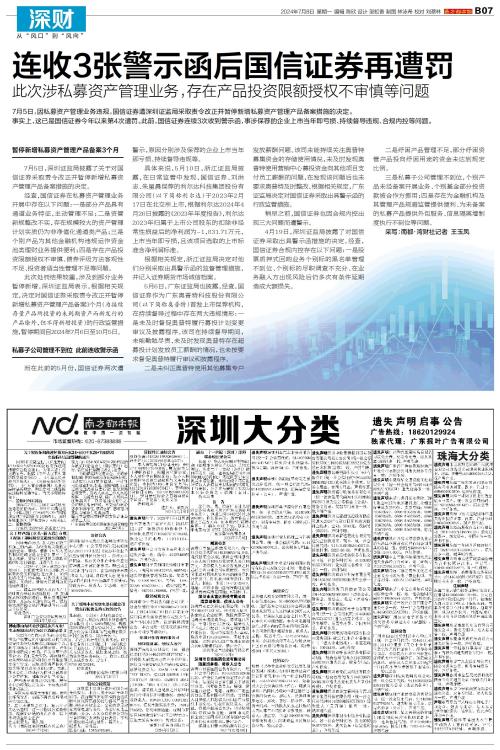 7月5日,因私募资产管理业务违规,国信证券遭深圳证监局采取责令改正并暂停新增私募资产管理产品备案措施的决定。 事实上,这已是国信证券今年以来第4次遭罚。此前,国信证券连续3次收到警示函,事涉保荐