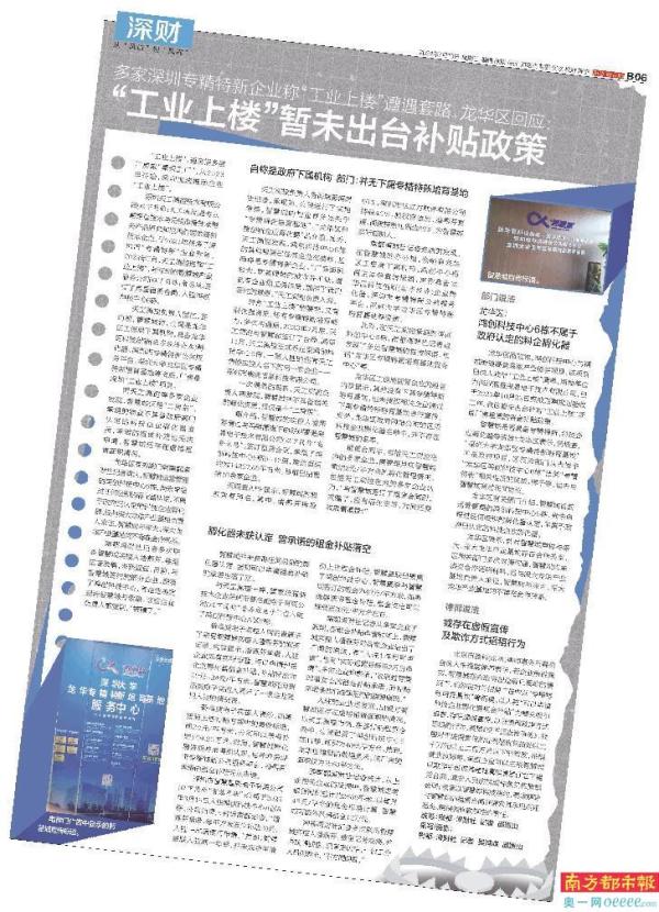 龙华工信局称,该公司还以所在园区纳入深圳市“工业上楼”清单为由吸引企业承租。经核实,截至目前,我区暂未出台针对“工业上楼”项目厂房租赁的补贴政策。