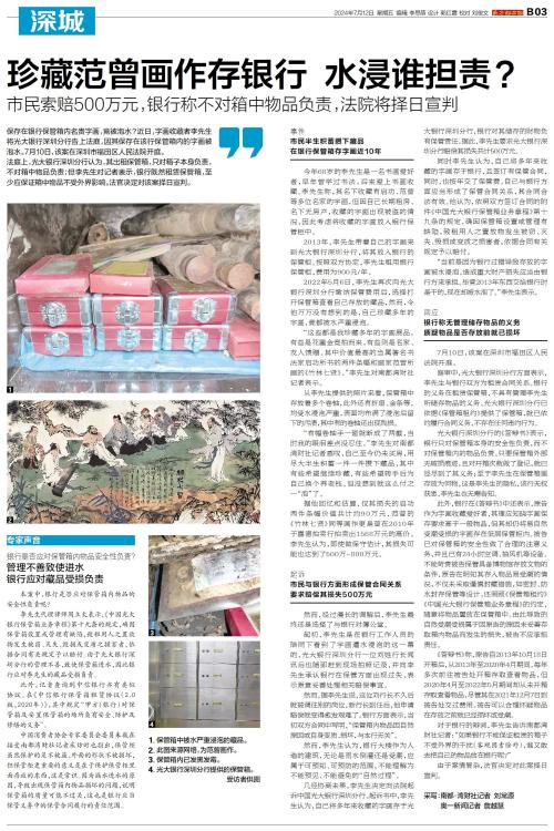 保存在银行保管箱内名贵字画,竟被泡水?近日,字画收藏者李先生将光大银行深圳分行告上法庭,因其保存在该行保管箱内的字画被泡水。7月10日,该案在深圳市福田区人民法院开庭。 法庭上,光大银行深圳分行