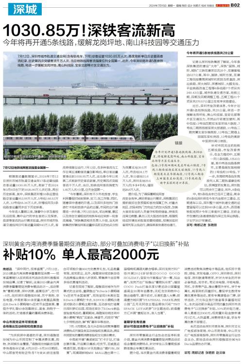 7月12日,深圳市城市轨道交通全网(含有轨电车,下同)总客运量1030.85万人次,再度刷新单日历史最高客流纪录,历史第四次突破客流千万人次,当日地铁线网客流强度位列全国第一。此外,今年深圳将开通