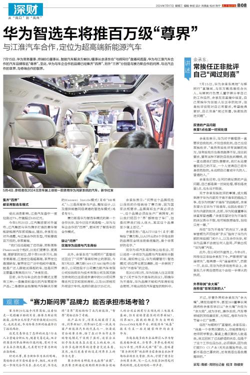 7月15日,华为常务董事、终端BG董事长、智能汽车解决方案BU董事长余承东在“与辉同行”直播间透露,华为与江淮汽车合作的汽车品牌取名“尊界”。至此,华为与车企合作的品牌已经集齐“四界”,另外“三界