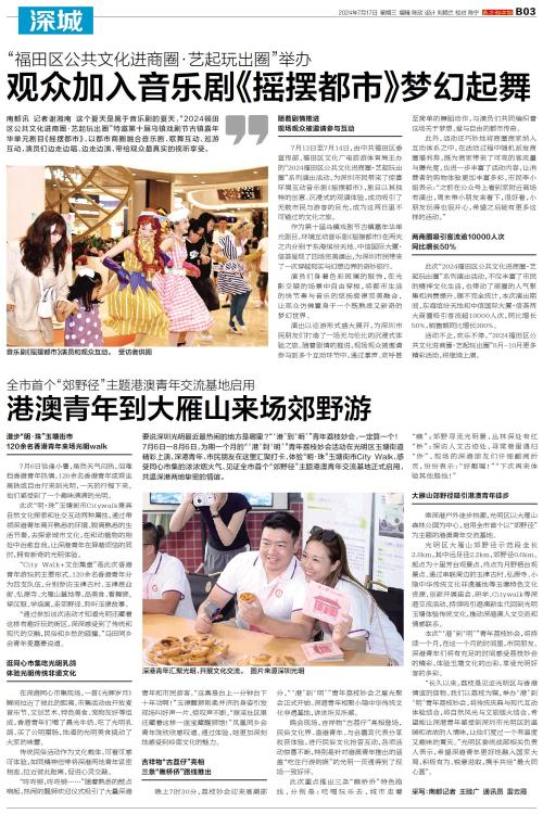 南都讯 记者谢湘南 这个夏天是属于音乐剧的夏天,“2024福田区公共文化进商圈·艺起玩出圈”特邀第十届乌镇戏剧节古镇嘉年华单元剧目《摇摆都市》,以都市商圈融合音乐剧、歌舞互动、巡游互动,演员们边走
