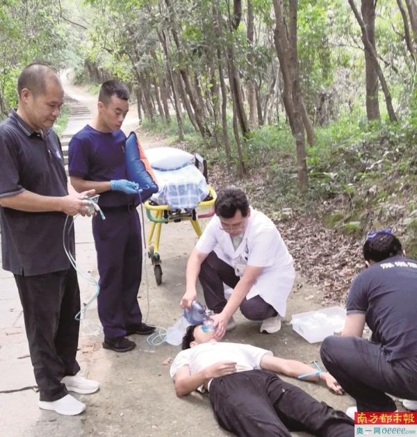 6月17日17时31分,罗湖区梧桐山小梧桐往弘法寺方向登云道靠电视塔处,一名20岁的男子登山一小时后出汗多,双足抽搐疼痛、乏力,不能行走,路人发现后报120。龙岗区第四人民医院急救医生龚益清、急救护士谢小红、急救驾驶员司机黄海锋收到指令后,经过“九转十八弯”,终于在18时16分到达现场。这名男子经初步诊断为中暑、电解质紊乱,遂送入医院治疗,几天后平安出院。