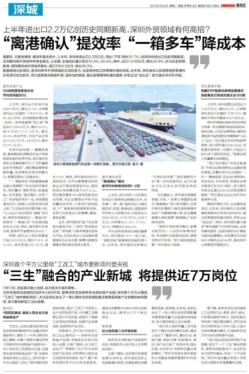 南都讯 记者张艳丽 据深圳海关统计,上半年,深圳市进出口2.2万亿元,同比(下同)增长31.7%,创深圳市进出口历史同期新高,在同期内地外贸城市中排名首位,占全国、全省的比重分别为10.4%、50
