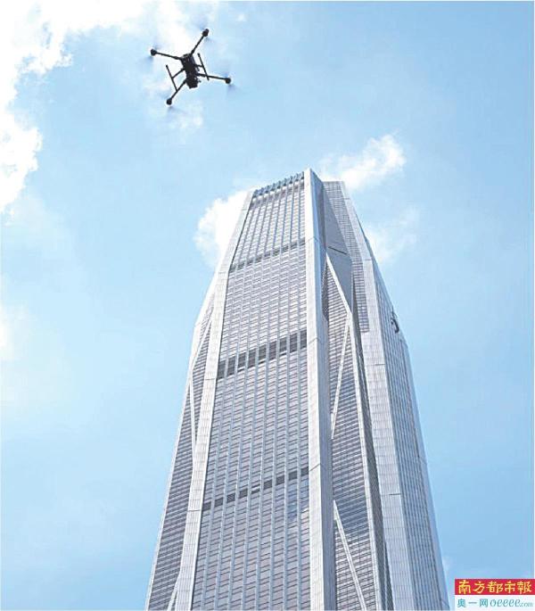 在深圳平安金融中心一架无人机搭载飞行系统,为城市建筑“健康体检”。 南都记者 霍健斌 摄