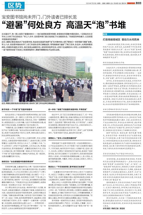 近日,南都记者实地走访了宝安图书馆,和这些在高温天选择“泡”在书堆中的人聊了聊他们一举多得的“避暑”故事。早上八点,宝安图书馆尚未开门,但门外的队伍早已蜿蜒成形,弯弯曲曲地“盘旋”了两三百米。队伍中,大多是背着双肩包、拎着帆布袋的大学生,他们或低头翻看手机,或和同伴轻声交谈。还有三五成群的中小学生,以及穿着格子衫、一副“程序员标配”打扮的上班族穿插其中,捧着热腾腾的包子边排队边啃。