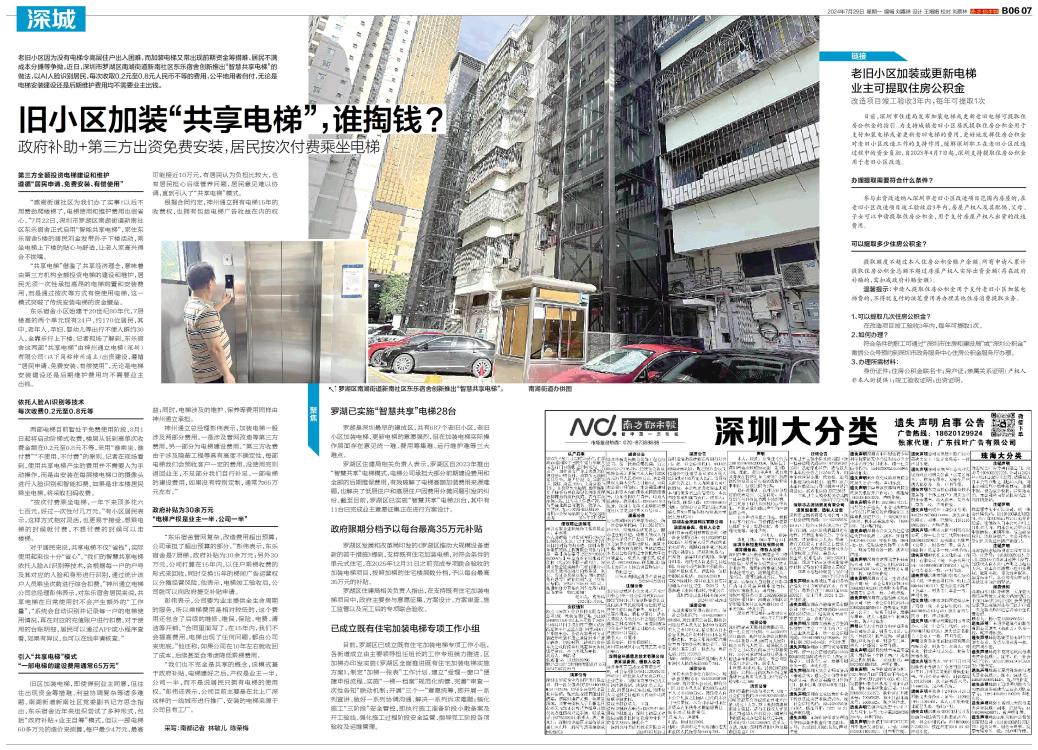 老旧小区因为没有电梯令高层住户出入困难,而加装电梯又常出现前期资金筹措难、居民不满成本分摊等争拗。近日,深圳市罗湖区南湖街道新南社区东乐宿舍创新推出“智慧共享电梯”的做法,以AI人脸识别居民,每次