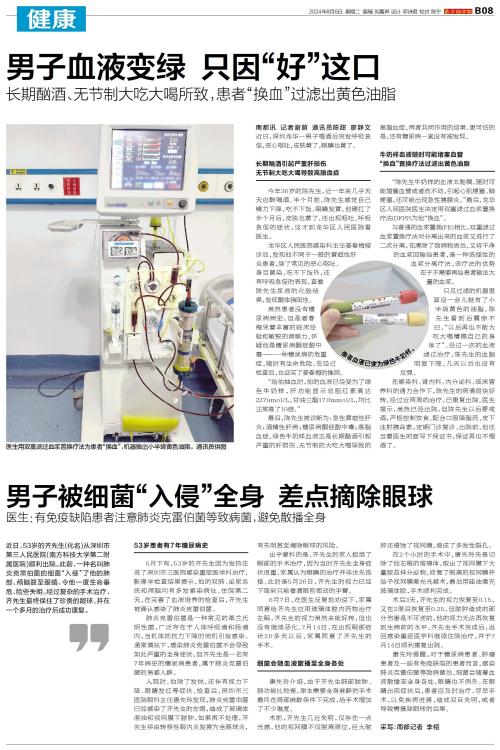 南都讯 记者谢萌 通讯员陈甜 廖静文 近日,深圳龙华一男子喝酒后突发呼吸急促,恶心呕吐,皮肤黄了,眼睛也黄了。 长期酗酒引起严重肝损伤 无节制大吃大喝导致高脂血症 今年36岁的陈先生,