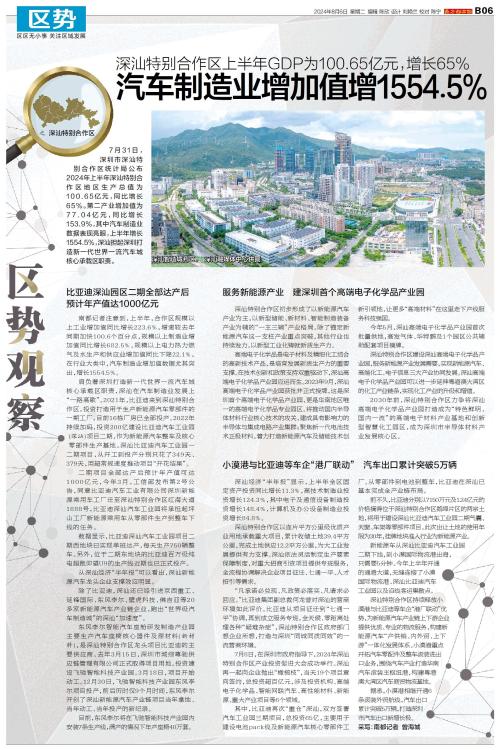 深汕特别合作区 7月31日,深圳市深汕特别合作区统计局公布2024年上半年深汕特别合作区地区生产总值为100.65亿元,同比增长65%。第二产业增加值为77.04亿元,同比增长153.9%,其中