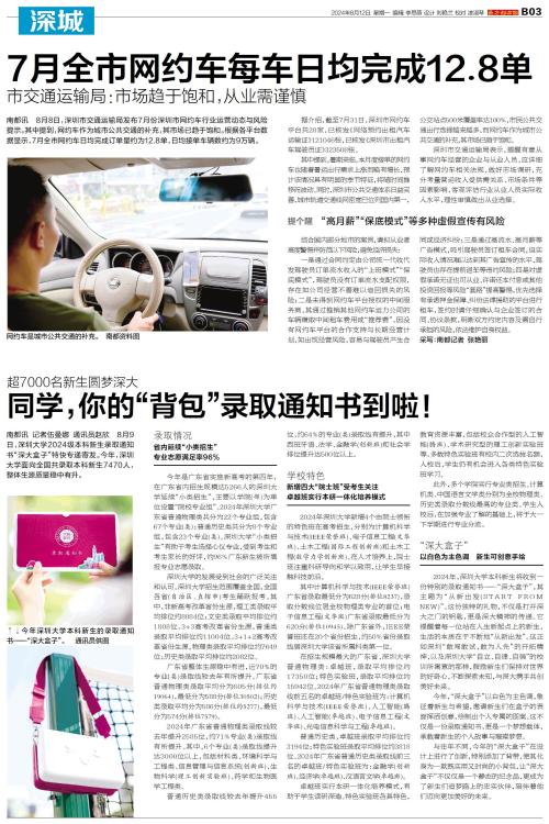南都讯 8月8日,深圳市交通运输局发布7月份深圳市网约车行业运营动态与风险提示。其中提到,网约车作为城市公共交通的补充,其市场已趋于饱和。根据各平台数据显示,7月全市网约车日均完成订单量约为12.