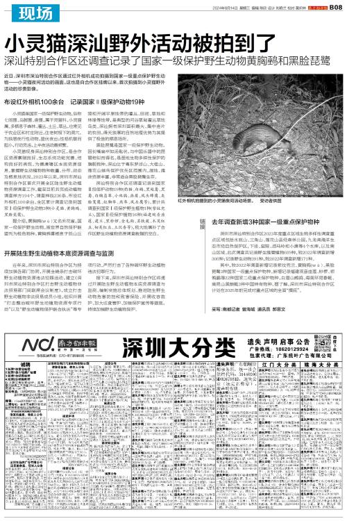 近日,深圳市深汕特别合作区通过红外相机成功拍摄到国家一级重点保护野生动物——小灵猫夜间活动的画面。这也是自合作区挂牌以来,首次拍摄到小灵猫野外活动的珍贵影像。 布设红外相机100余台 记录国家Ⅱ