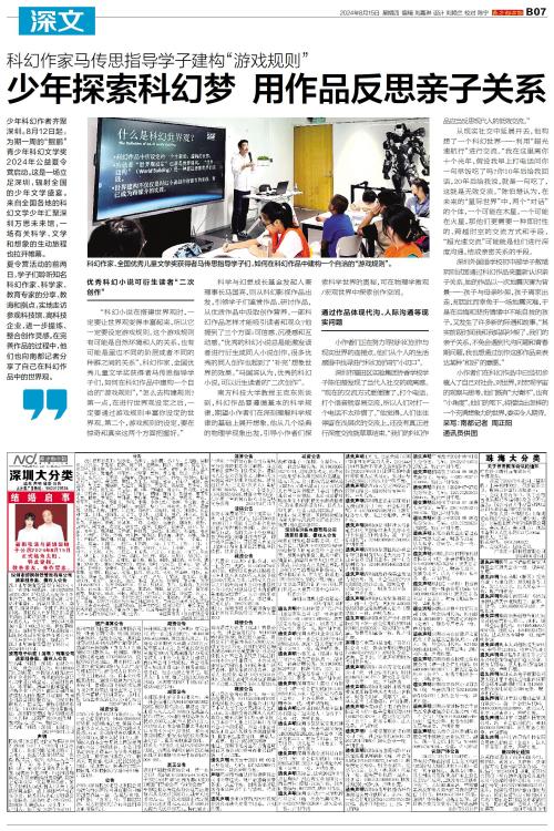 少年科幻作者齐聚深圳。8月12日起,为期一周的“鲲鹏”青少年科幻文学奖2024年公益夏令营启动。这是一场立足深圳,辐射全国的少年文学盛宴。来自全国各地的科幻文学少年汇聚深圳万思未来馆,一场有关科学