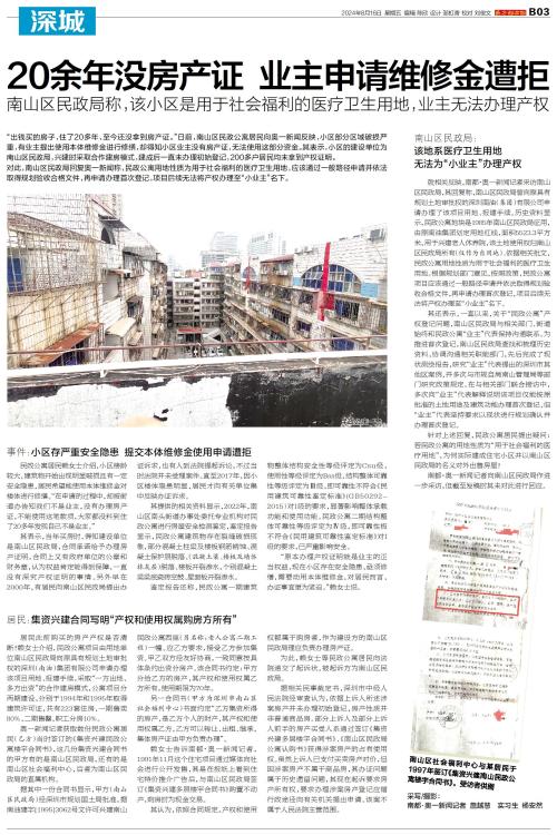 “出钱买的房子,住了20多年,至今还没拿到房产证。”日前,南山区民政公寓居民向奥一新闻反映,小区部分区域破损严重,有业主提出使用本体维修金进行修缮,却得知小区业主没有房产证,无法使用这部分资金。其