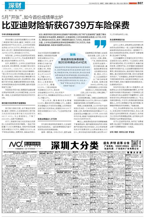 近日,备受市场关注的深圳比亚迪财产保险有限公司(下称“比亚迪财险”)披露了展业后的首份半年成绩单。数据显示,比亚迪财险上半年实现保险业务收入6726.23万元,净利润1846万元,其中二季度净利润