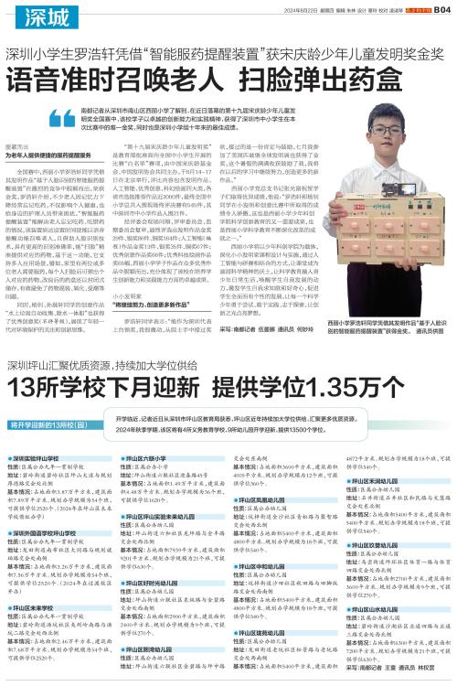 开学临近,记者近日从深圳市坪山区教育局获悉,坪山区近年持续加大学位供给,汇聚更多优质资源。2024年秋季学期,该区将有4所义务教育学校、9所幼儿园开学迎新,提供13500个学位。 将开学迎新的1