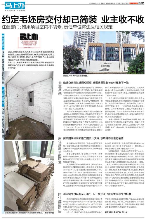 被点名单位 深圳市金桂商务信息有限公司 介入处理单位 深圳市宝安区住房和建设局 近日,深圳市宝安区凤鸣水岸花园期房项目出现延期交房情况。宝安区住建局回应称,开发企业拟交付时间为2024年9
