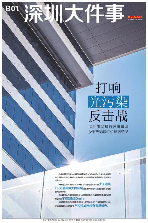 市住建局组织编制《建筑玻璃幕墙反射光影响评价标准(征求意见稿)》向社会公开征求意见。据《标准》,建筑物设置玻璃幕墙时应符合以下规定—— ●在居住建筑、医院、中小学校、幼儿园周边区域以及主干道路口