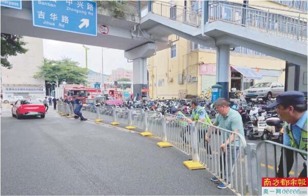 执法人员对电动自行车停放区域设置铁马进行物理围挡。