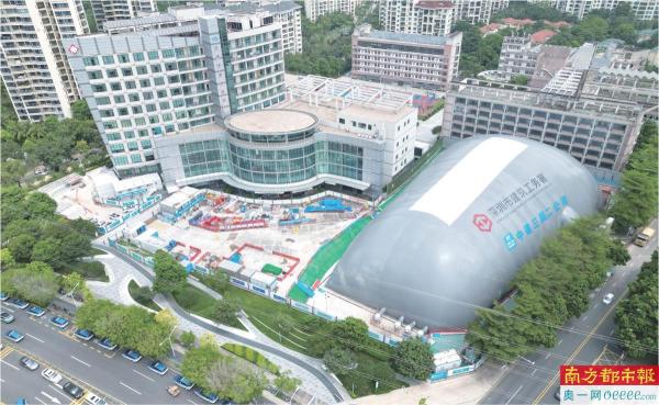 深圳市眼科医院二期工程项目位于深圳市福田区香蜜湖街道泽田路18号,地处正在运营的市眼科医院内,紧邻深圳高级中学中心校区北区,项目周边遍布住宅小区,人口稠密。因此,为推进工程建设,尽可能减少施工对周边市民生活的影响,项目积极探索新工艺、新技术,成功在施工工地安装大跨度、智能化、创新型的气承式基坑气膜,做到施工现场全覆盖,从源头解决施工扬尘、噪音等一系列问题。