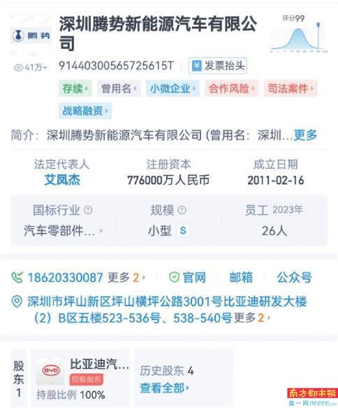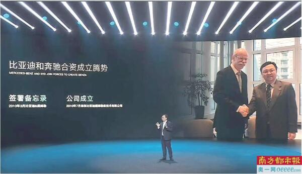 公开资料显示,2010年3月,比亚迪和奔驰母公司戴姆勒签署合作备忘录准备成立对等股份的合资企业;2011年2月16日,“深圳比亚迪戴姆勒新技术有限公司”注册成立,比亚迪汽车工业有限公司和戴姆勒大中华区投资有限公司各持股50%;2012年3月底,“腾势”品牌发布;2014年9月,腾势第一款车型面世;2016年11月7日,“深圳比亚迪戴姆勒新技术有限公司”正式更名为“深圳腾势新能源汽车有限公司”。
