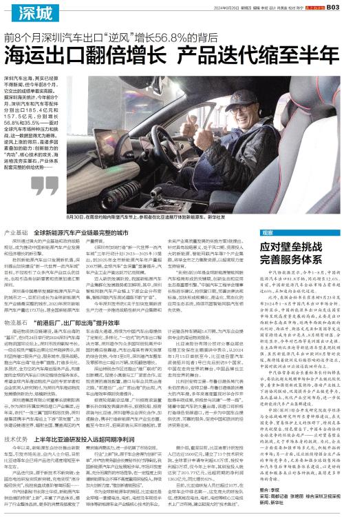 深圳汽车出海,其实已经算不得新闻,但今年前8个月,它交出的成绩单着实亮眼。 据深圳海关统计,今年前8个月,深圳汽车和汽车零配件分别出口185.4亿元和157.5亿元,分别增长56.8%和35.5