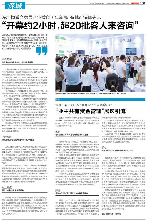 日前,2024深圳国际物业管理产业博览会(以下简称“物博会”)暨深圳房地产交易会在深圳会展中心馆开幕。本届博览会由深圳市物业管理行业协会、深圳市房地产业协会、深圳市房地产中介协会联合主办,全国10