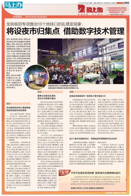 涉及单位 深圳市龙岗区坂田街道办 近日,有市民多次反映,坂田北地铁站附近存在流动摊贩无序摆卖堵塞人行道、乱扔垃圾、油烟过重扰民的情况。为改善地铁口乱摆卖阻碍市民交通出行、影响环境卫生、存在安全