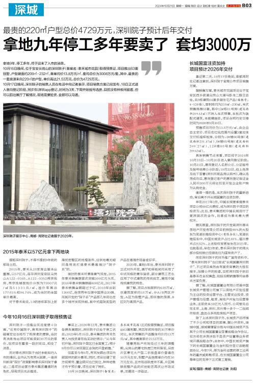 拿地9年、停工多年,终于迎来了入市的消息。 10月16日晚间,位于宝安尖岗山的深圳院子(备案名:泰禾城市花园)取得预售证,项目推出63套别墅,户型建面约209㎡-232㎡,备案均价13.8万元/