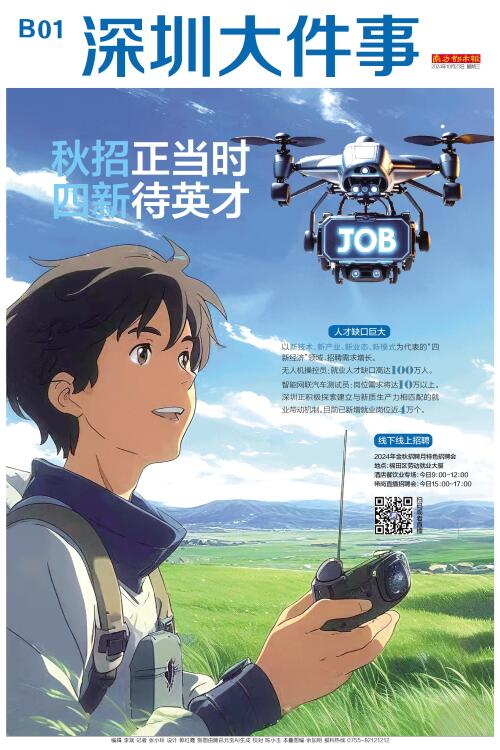 人才缺口巨大 以新技术、新产业、新业态、新模式为代表的“四新经济”领域,招聘需求增长。 无人机操控员:就业人才缺口高达100万人。 智能网联汽车测试员:岗位需求将达10万以上。 深圳正积极