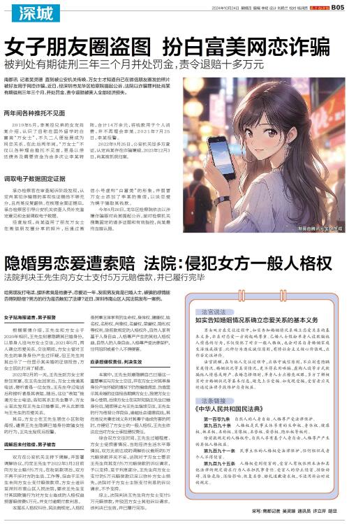 南都讯 记者吴灵珊 直到被公安机关传唤,万女士才知道自己在微信朋友圈发的照片被好友用于网恋诈骗。近日,经深圳市龙华区检察院提起公诉,法院以诈骗罪判处肖某有期徒刑三年三个月,并处罚金,责令退赔被害人
