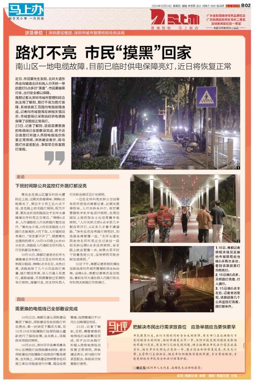涉及单位 深铁建设集团、深圳市城市管理和综合执法局 近日,市民粟先生发现,北环大道东西走向辅道北环科苑人行天桥一带的路灯6点多仍“黑着”,市民要摸黑行走,出行安全难以保障。 南都记者从深圳市
