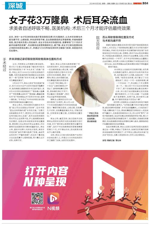 近日,深圳一女子在深圳阳光医疗美容医院花费3万元隆鼻后,认为术后效果与术前沟通不符,山根较高,并自述呼吸不畅,且左侧鼻基底挤压牙龈疼痛,怀疑有戳穿风险。院方相关负责人回应表示,该女子仍在术后恢复阶