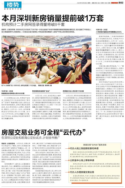 南都讯 记者陈荣梅 深圳市9月29日发布了《关于进一步优化房地产市场平稳健康发展政策措施的通知》后,极大提振了市场信心,各大楼盘销售中心购销两旺,二手房成交量大幅增加,市场活跃度显著提升,房地产市