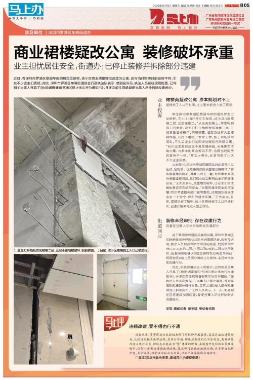 涉及单位 深圳市罗湖区东晓街道办 近日,有深圳市罗湖区翠园华府的居民反映称,该小区商业裙楼疑似改造为公寓,这与当时购房时的宣传不符,引发不少业主们质疑。对此,深圳市罗湖区东晓街道综合行政执法队
