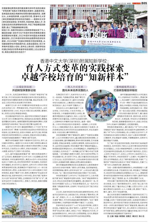 知新学校在全校实行“1+N”学生成长导师制。 香港中文大学(深圳)附属知新学校校园。 同学们打篮球。 在国家推动教育优质均衡发展与深圳市龙岗区建设“学有优