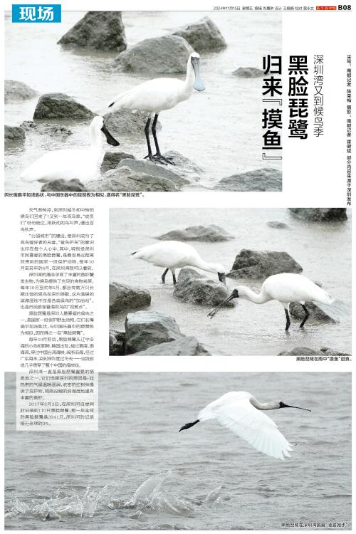 因长嘴扁平如汤匙状,与中国乐器中的琵琶极为相似,遂得名“黑脸琵鹭”。 黑脸琵鹭在雨中“摸鱼”进食。 黑脸琵鹭在深圳湾施展“凌波微步”。