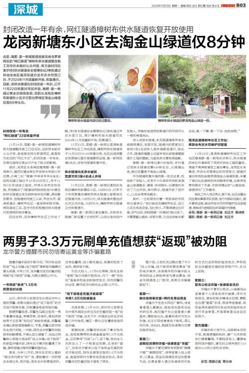 此前,南都·奥一新闻报道连接龙岗与罗湖两区的“网红隧道”樟树布供水隧道整改施工完毕后未能对公众开放,官方彼时回应表示待《供水隧道安全管理协议》审批通过并由龙岗区南湾街道办及布吉水司签订后,于202