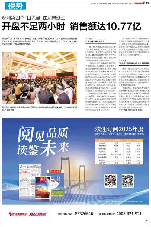 时隔一个月,深圳第四个“日光盘”诞生。11月24日,位于深圳龙岗的深铁阅云境首推214套房源,开盘不足两小时全数售罄,去化率100%,销售额达10.77亿元,成为龙岗区近年来首个“开盘即售罄”项目