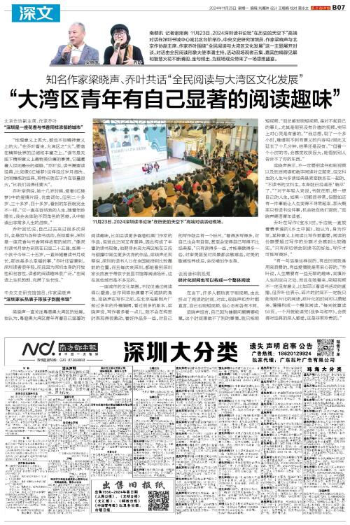 南都讯 记者谢湘南 11月23日,2024深圳读书论坛“在历史的天空下”高端对话在深圳书城中心城北区台阶举办。中央文史研究馆馆员、作家梁晓声与北京作协副主席、作家乔叶围绕“全民阅读与大湾区文化发展