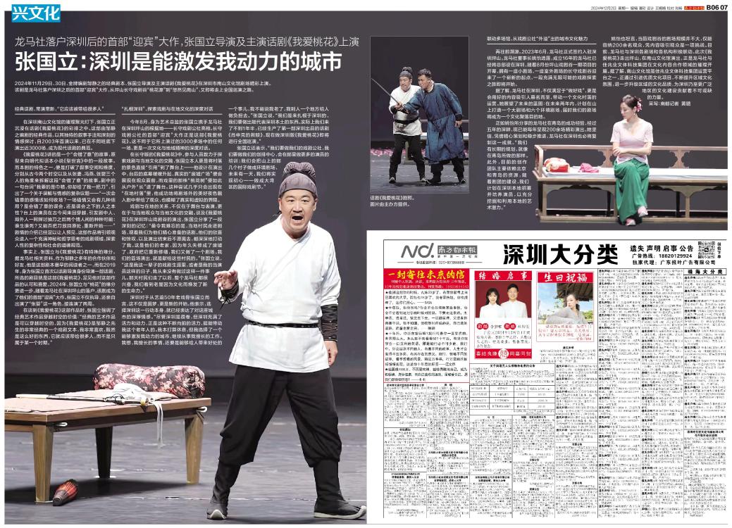 话剧《我爱桃花》剧照。图片由主办方提供。 2024年11月29日、30日,金牌编剧邹静之的经典剧本、张国立导演及主演话剧《我爱桃花》在深圳市