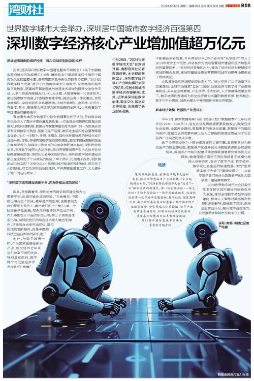 11月28日,“2024世界数字城市大会”在深圳开幕。南都湾财社记者现场获悉,大会期间数据显示,深圳数字经济核心产业增加值已突破1万亿元,位居中国城市数字经济百强第四。此外,近年来深圳在数字治理、