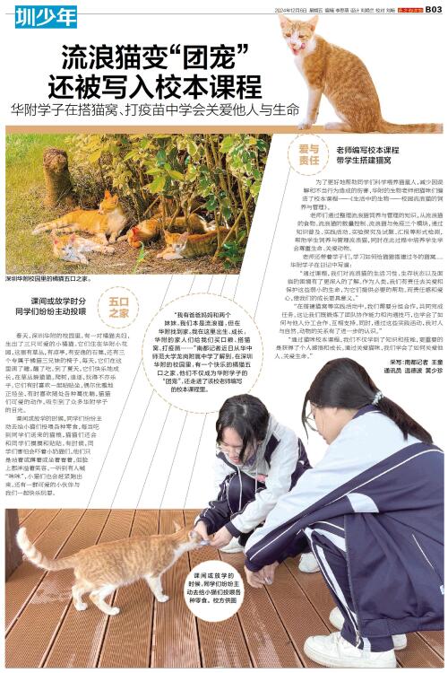 “我有爸爸妈妈和两个妹妹,我们本是流浪猫,但在华附找到家。我在这里出生、成长,华附的家人们给我们买口粮、搭猫窝、打疫苗……”南都记者近日从华中师范大学龙岗附属中学了解到,在深圳华附的校园里,有