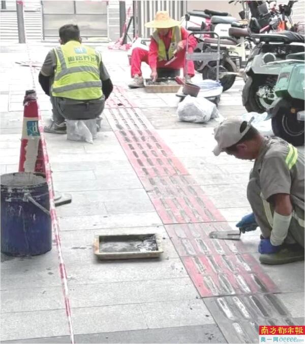不锈钢盲道正更换为水泥盲道。 网络图片
